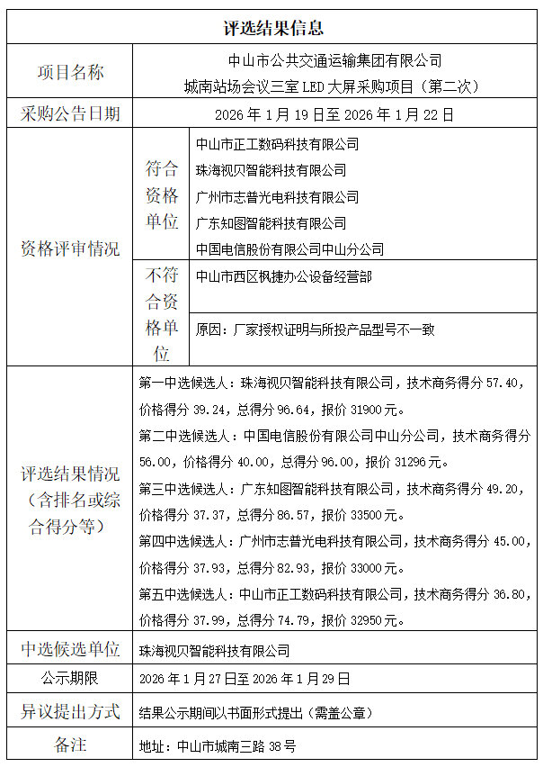 中山市公共交通运输集团有限公司城南站场会议三室LED大屏采购项目(第二次)评选结果公示