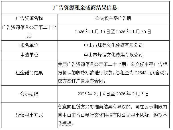 中山市香山畅行文化科技有限公司广告资源租金磋商结果公示