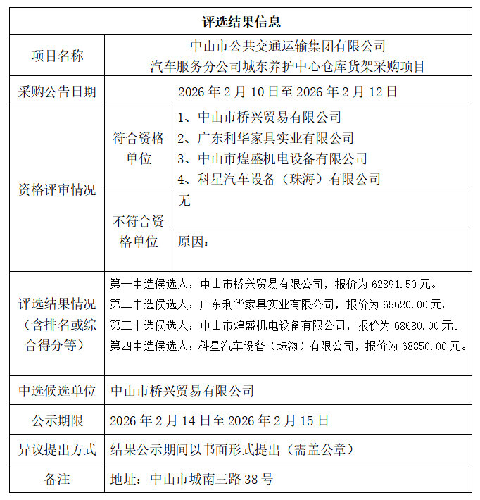 中山市公共交通运输集团有限公司汽车服务分公司城东养护中心仓库货架采购项目评选结果公示