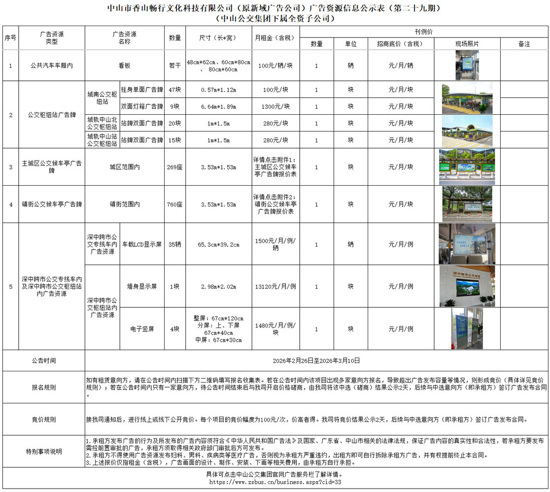 中山市香山畅行文化科技有限公司(原新域广告公司)广告资源信息公示表(第二十九期)(中山公交集团下属全资子公司)