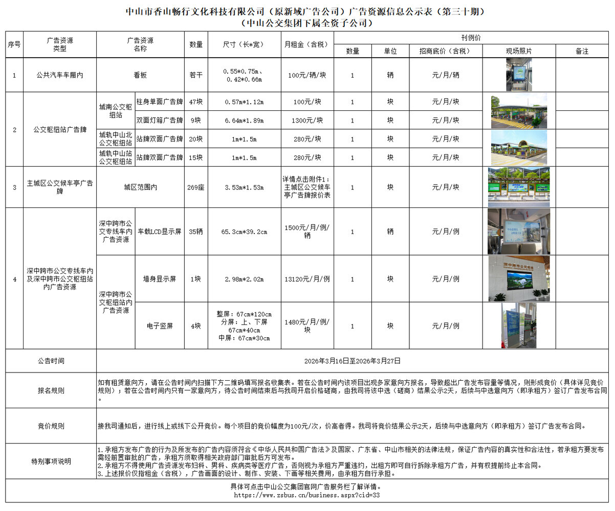 中山市香山畅行文化科技有限公司(原新域广告公司)广告资源信息公示表(第三十期)(中山公交集团下属全资子公司)