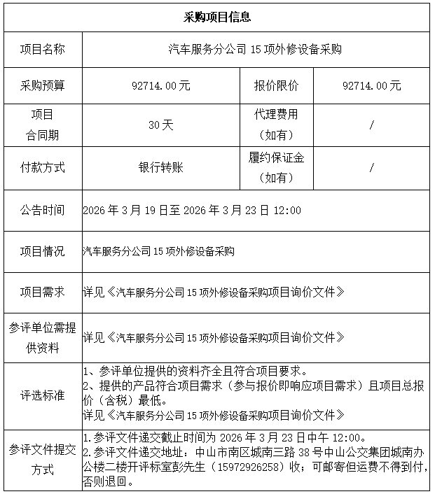 中山市公共交通运输集团有限公司汽车服务分公司15项外修设备采购