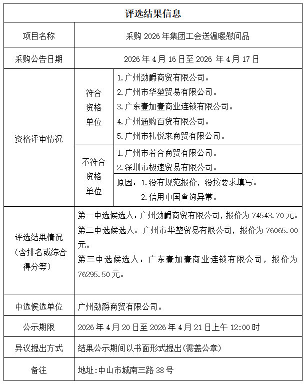 中山市公共交通运输集团有限公司工会委员会采购2026年集团工会送温暖慰问品项目评选结果信息公示