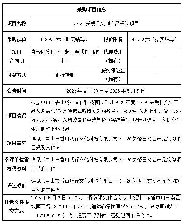中山市公共交通运输集团有限公司5·20关爱日文创产品采购项目
