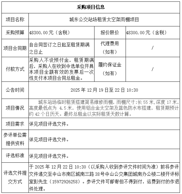 中山市公共交通运输集团有限公司城东公交站场租赁太空架雨棚项目