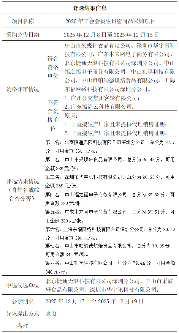 中山市公共交通运输集团有限公司工会委员会2026年工会会员生日慰问品采购项目评选结果公示
