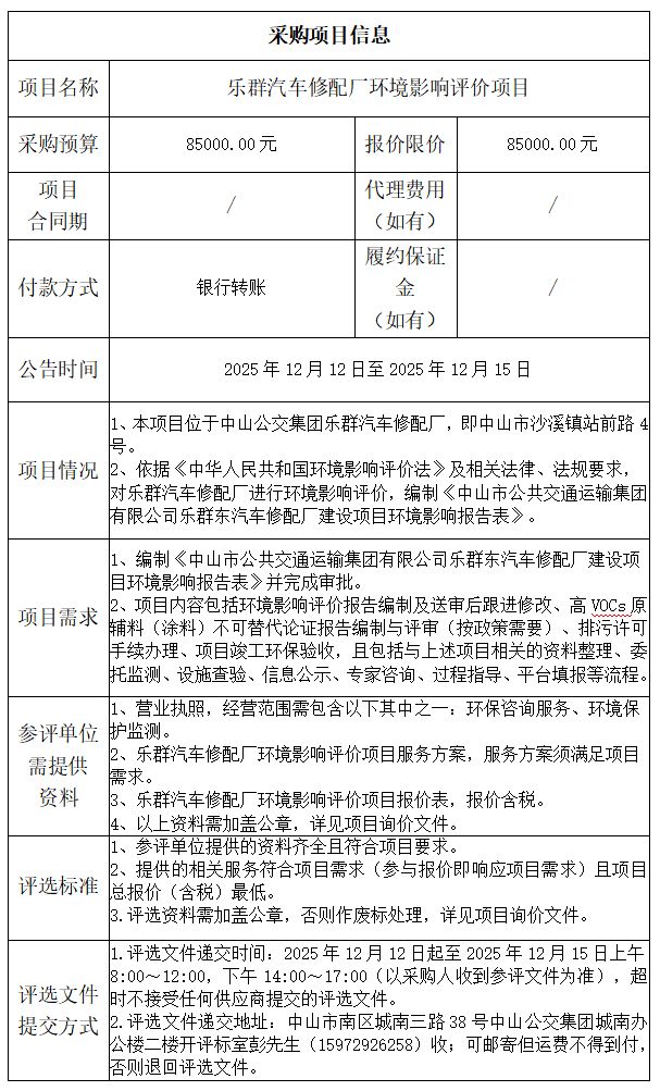 乐群汽车修配厂环境影响评价项目询价文件