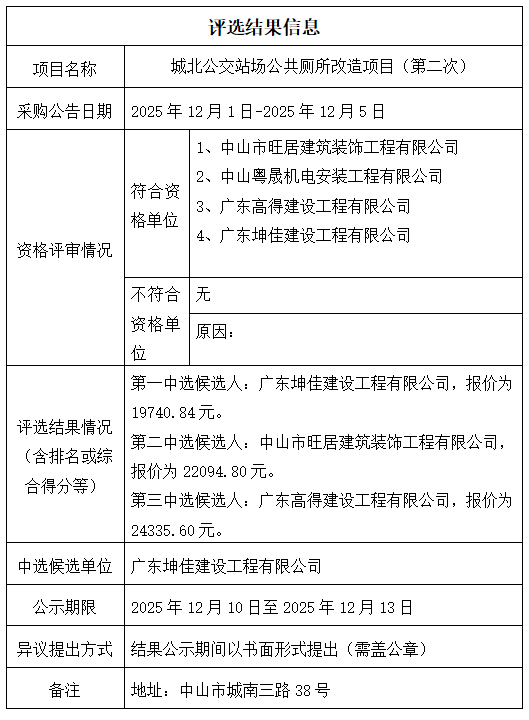 中山市公共交通运输集团有限公司城北公交站场公共厕所改造项目(第二次)评选结果公示