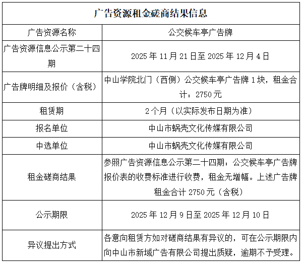 中山市新域广告有限公司广告资源租金磋商结果公示