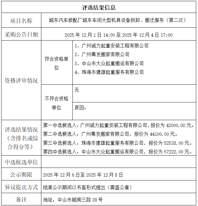 中山市公共交通运输集团有限公司城东汽车修配厂城东车间大型机具设备拆卸、搬迁服务(第二次)评选结果公示