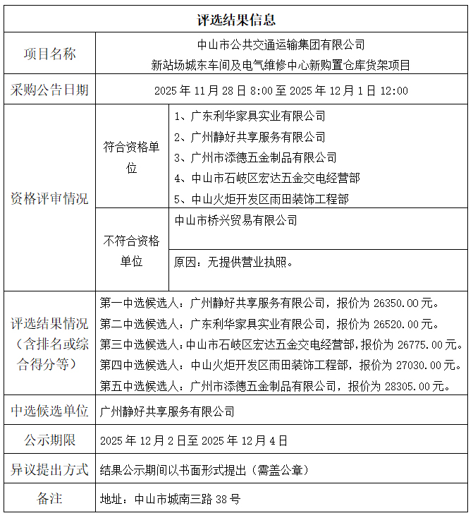 中山市公共交通运输集团有限公司新站场城东车间及电气维修中心新购置仓库货架项目评选结果公示