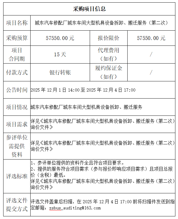 城东汽车修配厂城东车间大型机具设备拆卸、搬迁服务项目(第二次)询价文件
