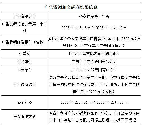 中山市新域广告有限公司广告资源租金磋商结果公示