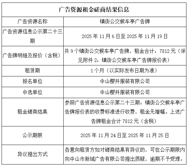 中山市新域广告有限公司广告资源租金磋商结果公示