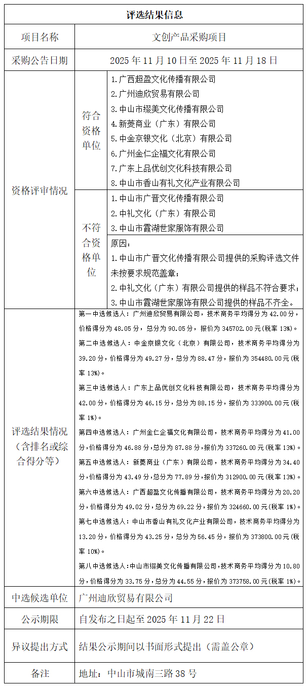 中山市公共交通运输集团有限公司文创产品采购项目评选结果公示