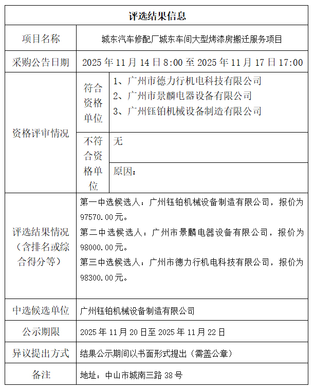 中山市公共交通运输集团有限公司城东汽车修配厂城东车间大型烤漆房搬迁服务项目评选结果公示