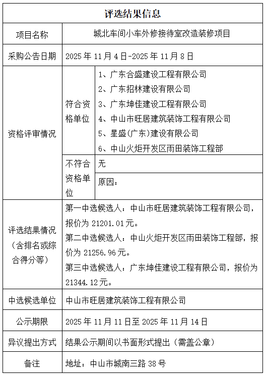 中山市公共交通运输集团有限公司城北车间小车外修接待室改造装修项目评选结果信息公示