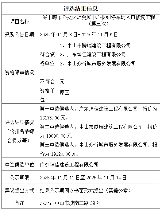 中山市公共交通运输集团有限公司深中跨市公交火炬会展中心枢纽停车场入口修复工程(第三次)评选结果信息公示