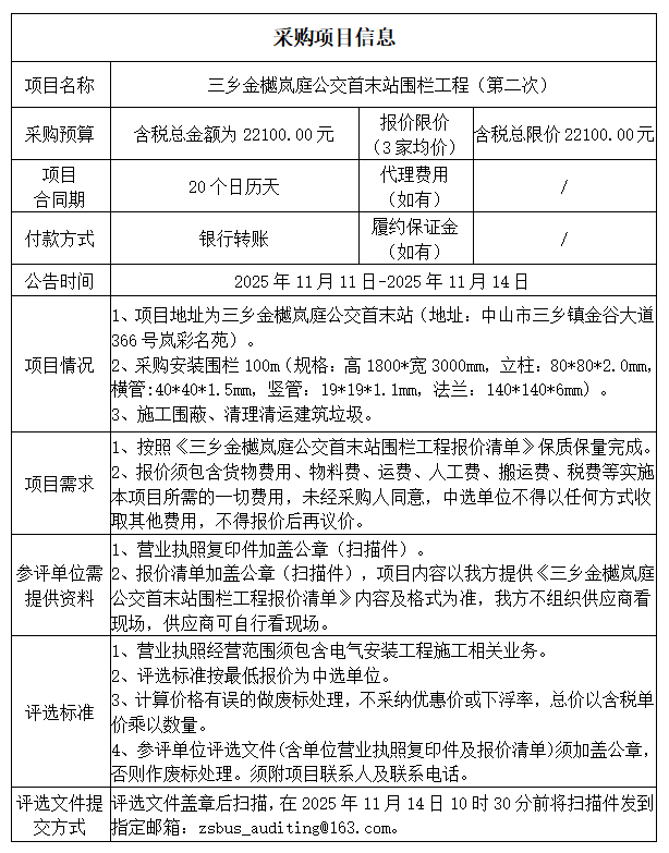 中山市公共交通运输集团有限公司三乡金樾岚庭公交首末站围栏工程(第二次)