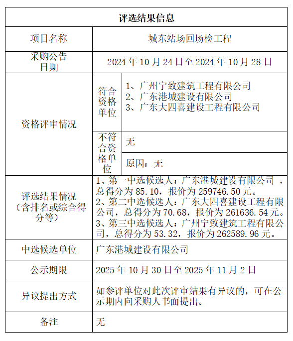 中山市公共交通运输集团有限公司城东站场回场检工程评选结果公示