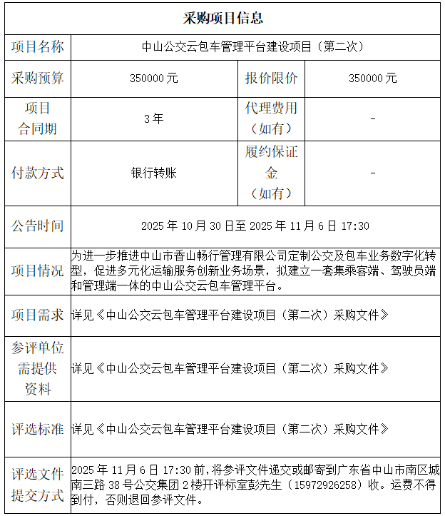 中山市公共交通运输集团有限公司中山公交云包车管理平台建设项目(第二次)