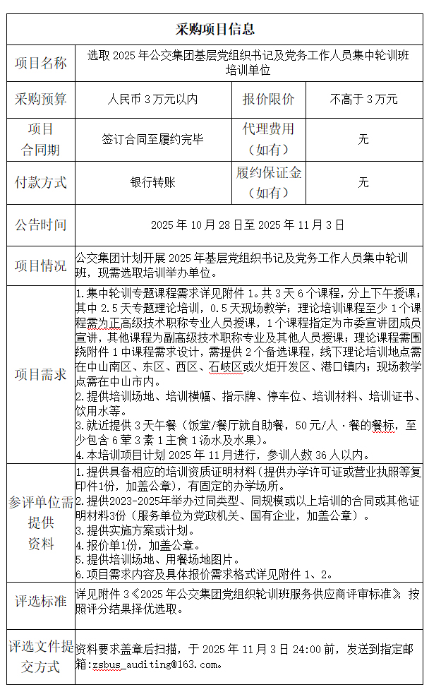 2025年公交集团党组织轮训班服务供应商评审标准