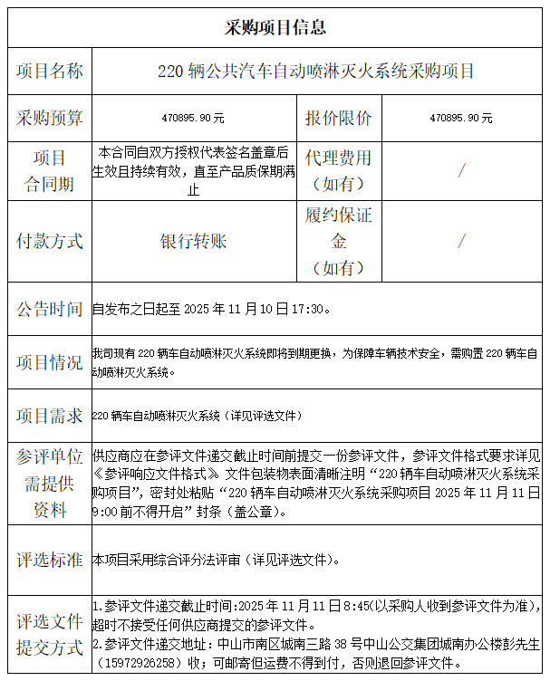 中山市公共交通运输集团有限公司220辆公共汽车自动喷淋灭火系统采购项目