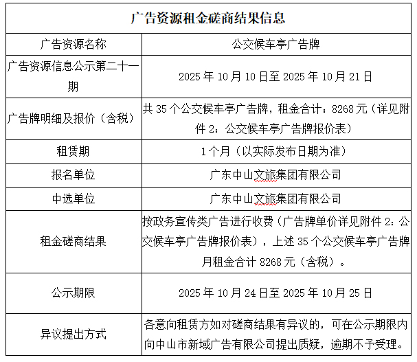 中山市新域广告有限公司广告资源租金磋商结果公示