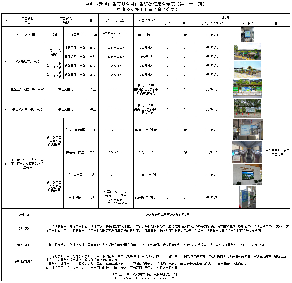 中山市新域广告有限公司广告资源信息公示表(第二十二期)(中山公交集团下属全资子公司)