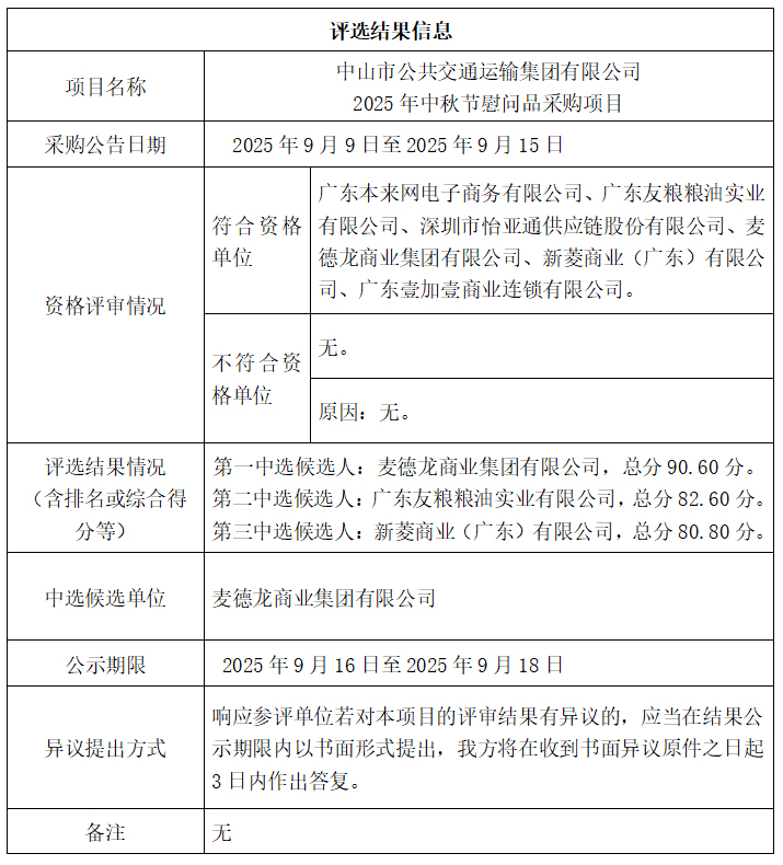 中山市公共交通运输集团有限公司2025年中秋节慰问品采购项目评选结果公示