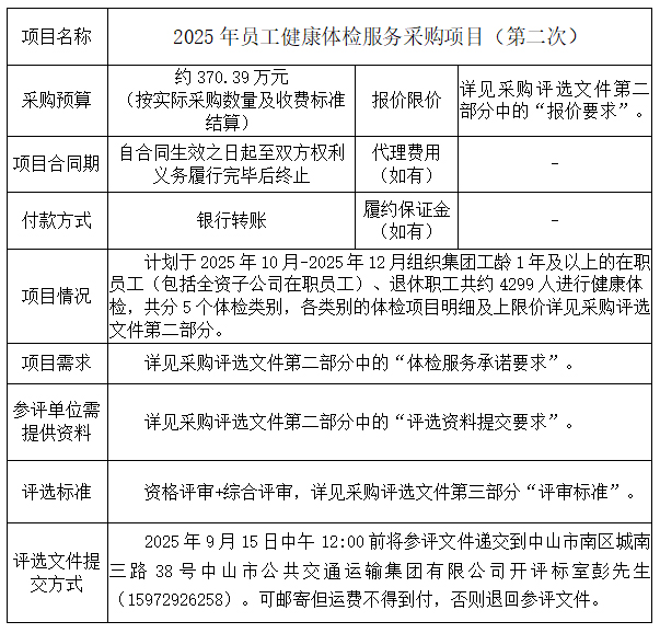 中山市公共交通运输集团有限公司2025年员工健康体检服务采购项目(第二次)