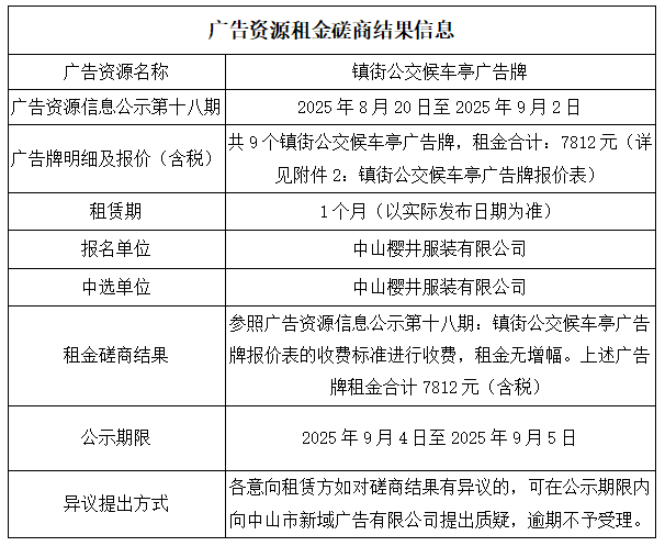 中山市新域广告有限公司广告资源租金磋商结果公示