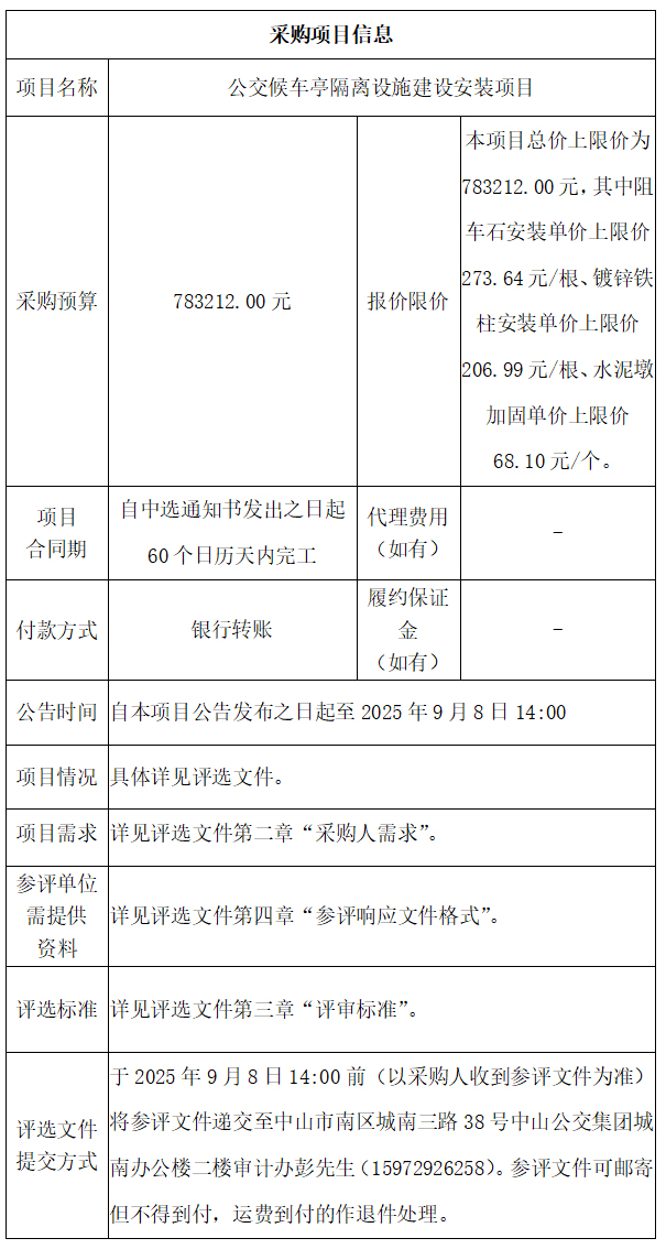 中山市公共交通运输集团有限公司公交候车亭隔离设施建设安装项目
