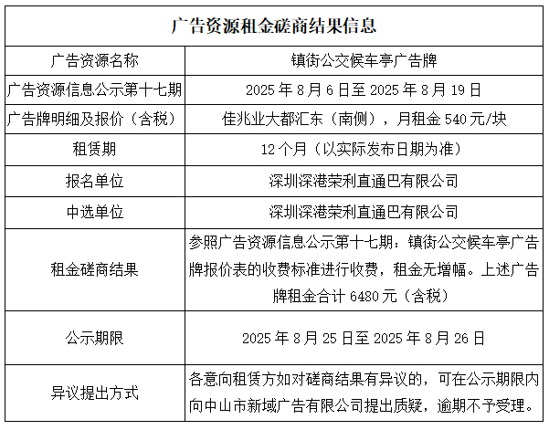 中山市新域广告有限公司广告资源租金磋商结果公示