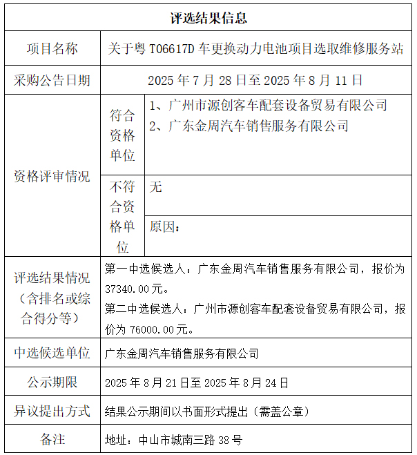 中山市公共交通运输集团有限公司关于粤T06617D车更换动力电池项目选取维修服务站项目评选结果公示