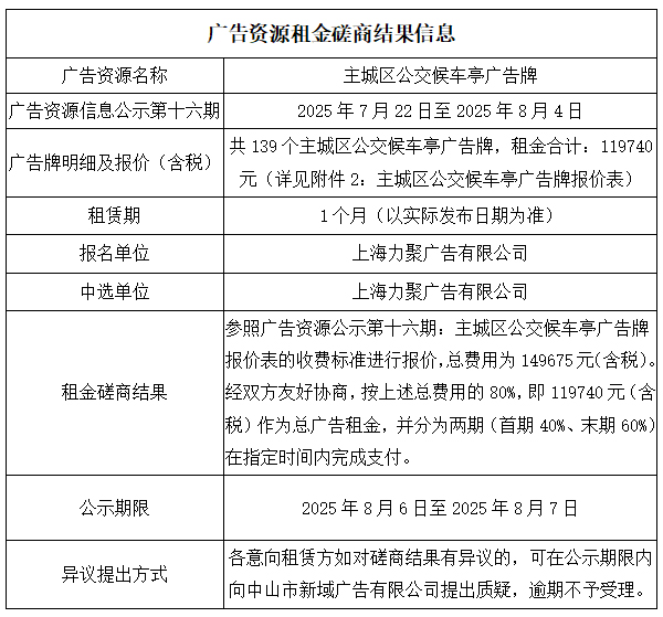 中山市新域广告有限公司广告资源租金磋商结果公示