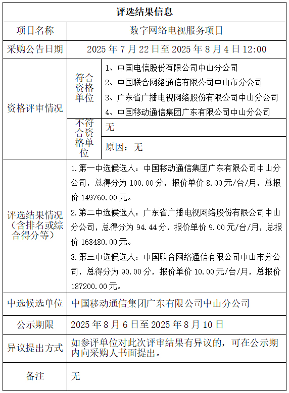 中山市公共交通运输集团有限公司数字网络电视服务项目评选结果公示