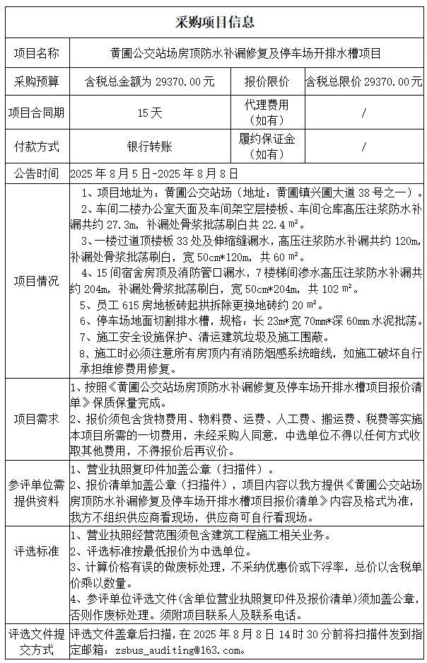 中山市公共交通运输集团有限公司黄圃公交站场房顶防水补漏修复及停车场开排水槽项目