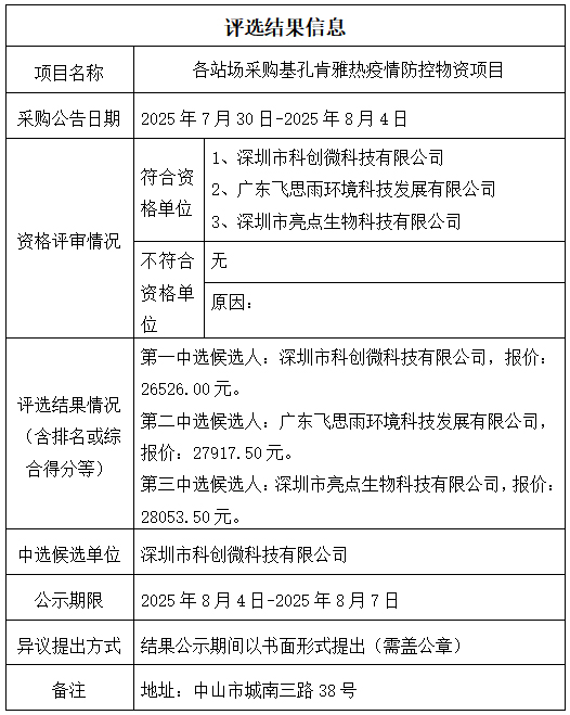 中山市公共交通运输集团有限公司各站场采购基孔肯雅热疫情防控物资项目评选结果公示