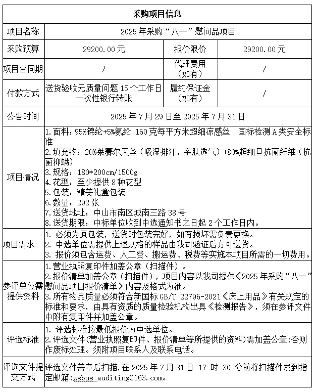 中山市公共交通运输集团有限公司2025年采购“八一”慰问品项目
