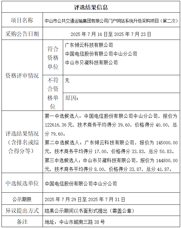 中山市公共交通运输集团有限公司门户网站系统升级采购项目(第二次)评选结果公示