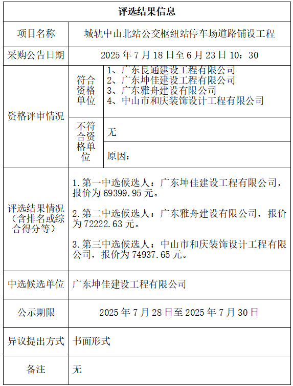 中山市公共交通运输集团有限公司城轨中山北站公交枢纽站停车场道路铺设工程项目评选结果公示
