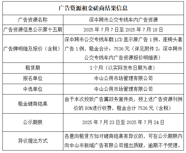 中山市新域广告有限公司广告资源租金磋商结果公示