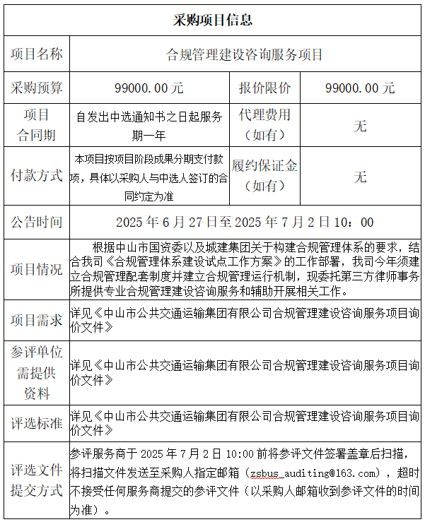 中山市公共交通运输集团有限公司合规管理建设咨询服务项目