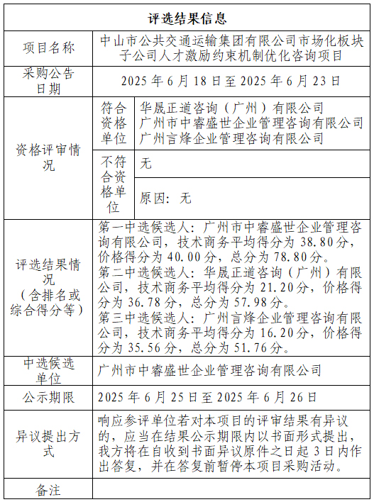 中山市公共交通运输集团有限公司市场化板块子公司人才激励约束机制优化咨询项目评选结果公示
