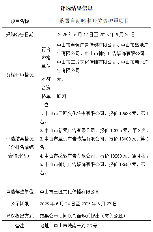 中山市公共交通运输集团有限公司购置自动喷淋开关防护罩项目评选结果公示