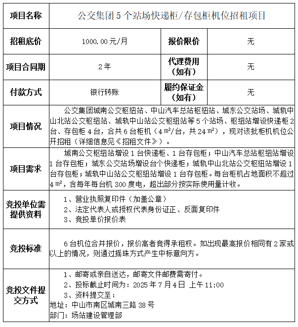 中山市公共交通运输集团有限公司5个站场快递柜/存包柜机位招租项目