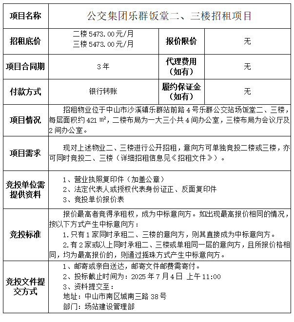 中山市公共交通运输集团有限公司乐群饭堂二、三楼招租项目