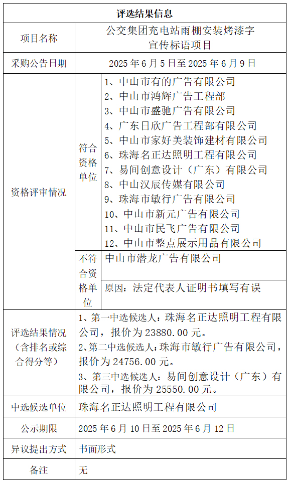 中山市公共交通运输集团有限公司充电站雨棚安装烤漆字宣传标语项目评选结果公示