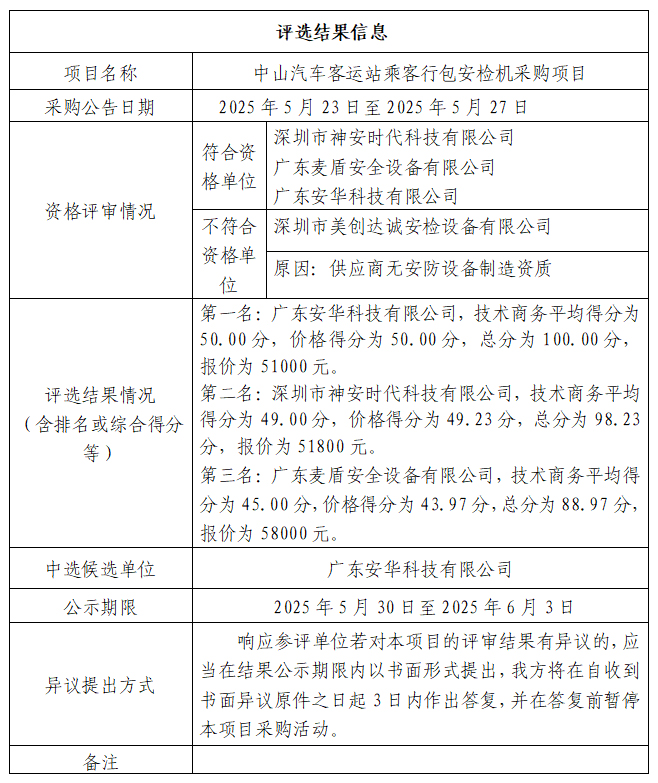 中山市公共交通运输集团有限公司中山汽车客运站乘客行包安检机采购项目评选结果公示